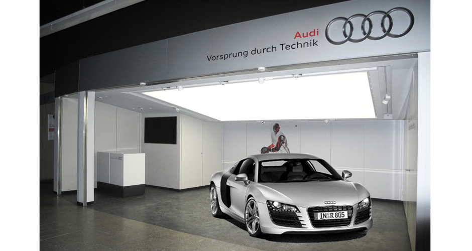 Příklad akusticky pohltivého podhledu plnícího zároveň funkci umělého osvětlení