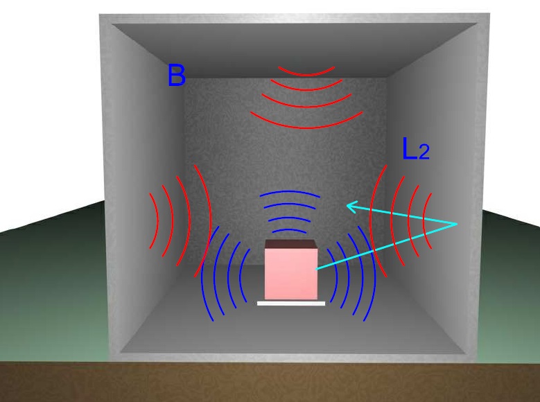 Schéma hluku odraženého od odrazivých povrchů stěn a stropu